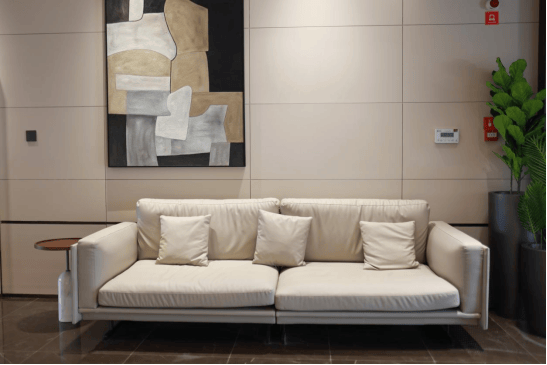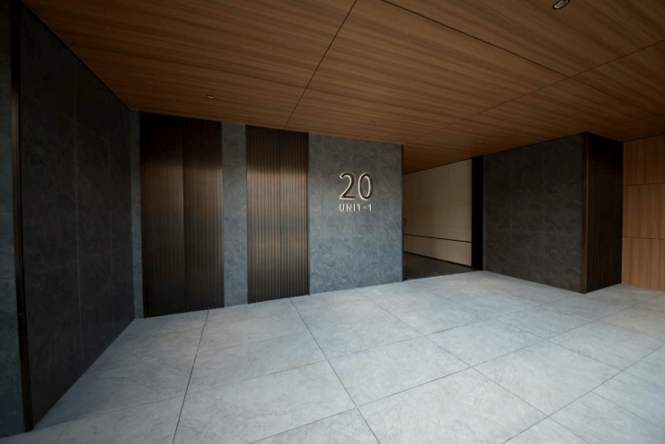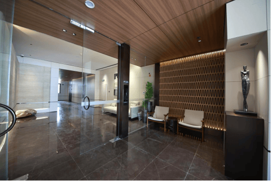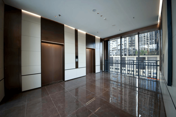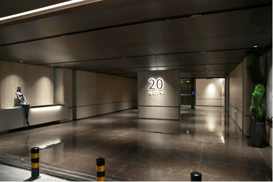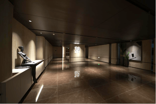 举步组团主入口,映入眼帘的是铝板一体成型搭配格栅工艺的迎宾大堂,气势与气派兼具;室内电梯门、防火门与金属板面统一深褐色系,与肤感黄色墙砖相融相撞,无时无刻不透露出沉稳大气;而地面与墙面100%精准对缝工艺,更是将产品设计上的精细工法和细腻美感展现得淋漓尽致。