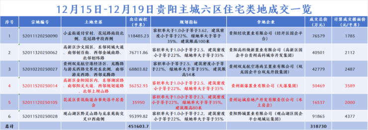 2025年12月15日至12月19日,贵阳主城六区再成功出让6宗宅地,总出让面积超45万方,总成交价近32亿元。
