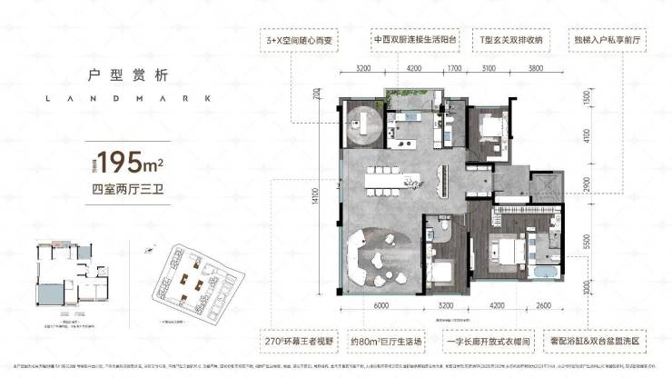 以本次开盘的建筑面积约195㎡的户型为例,约80㎡的天幕巨厅采用了LDKG的一体化设计,让客厅、餐厅、厨房融为一体,拥有270°环幕王者视野和双面采光,实现空间的无限延伸。而4+1百变空间则展现出超强的实用性,约37㎡的星级主卧,书写上层舒适生活的格局。这些无不展示龙湖天曜领峯对高端居住体验的深刻洞察。