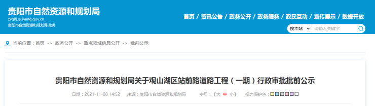 11月8日,贵阳市自然资源和规划局发布了观山湖区站前路道路工程(一期)行政审批批前公示。