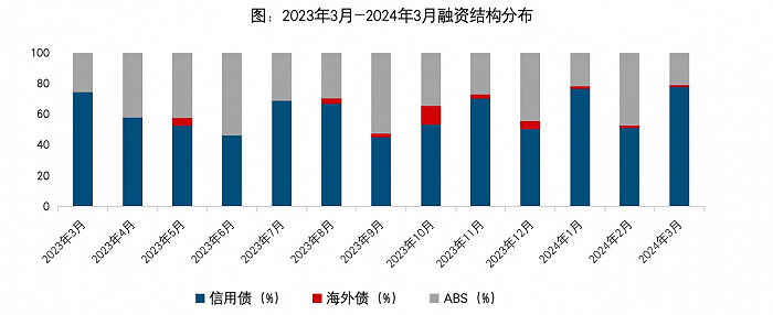 从融资结构来看,3月行业信用债发行量环比大幅增长,ABS发行量则有小幅下降。